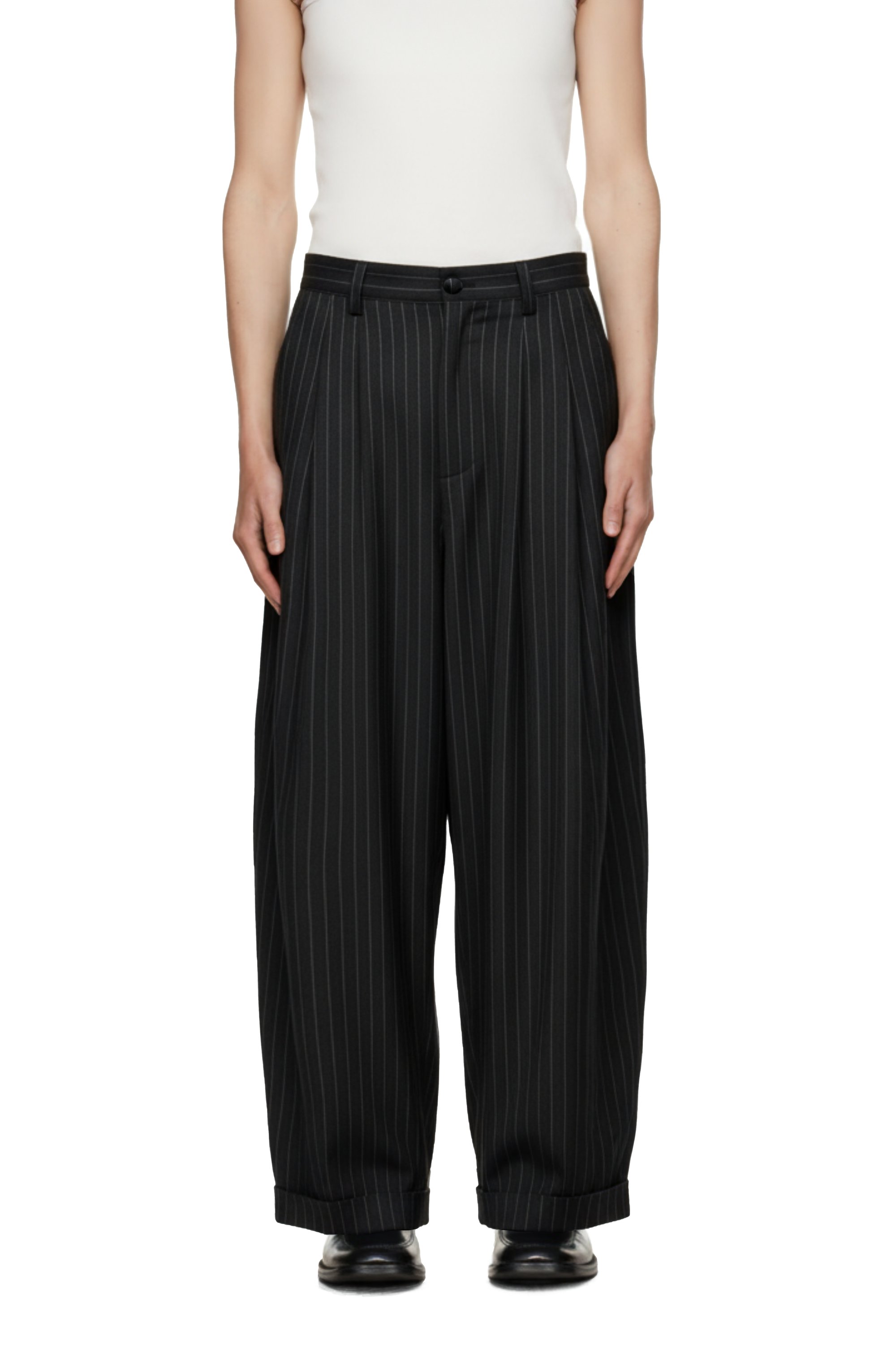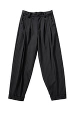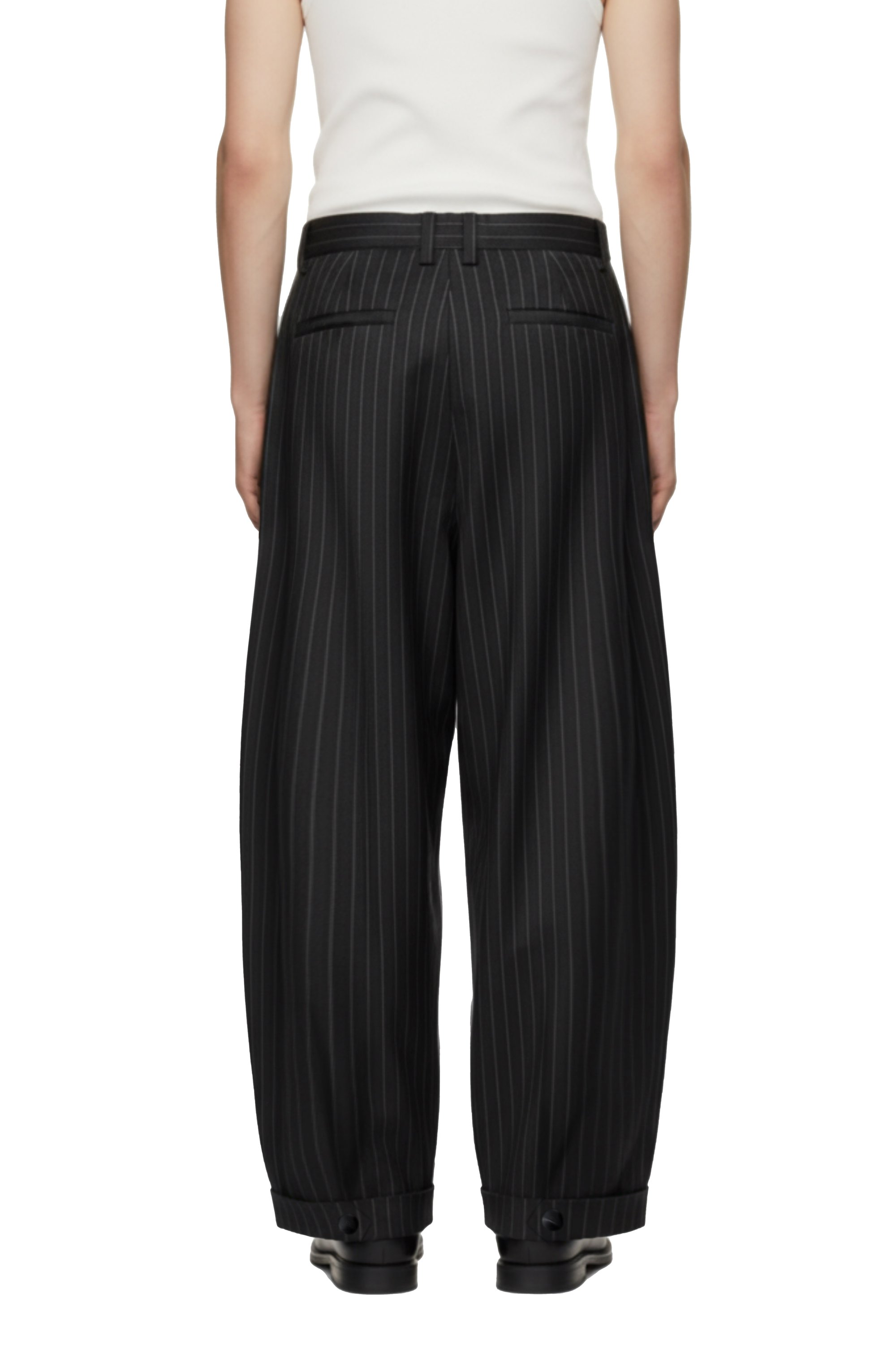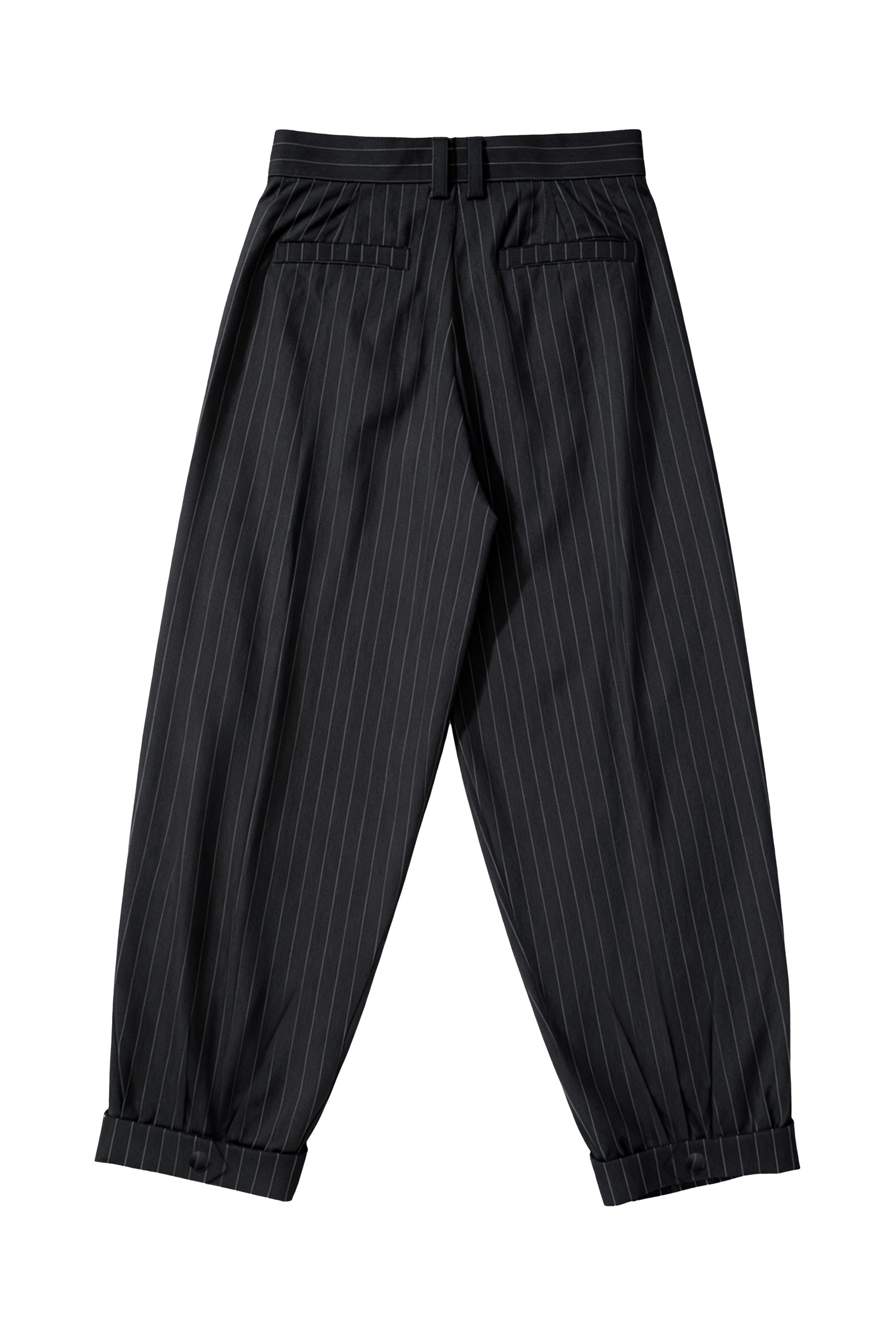 Wide-leg trousers with high waist, belt loops, front pleats, button and zip fly closure. Rolled cuffs at hem. Relaxed fit through the leg.