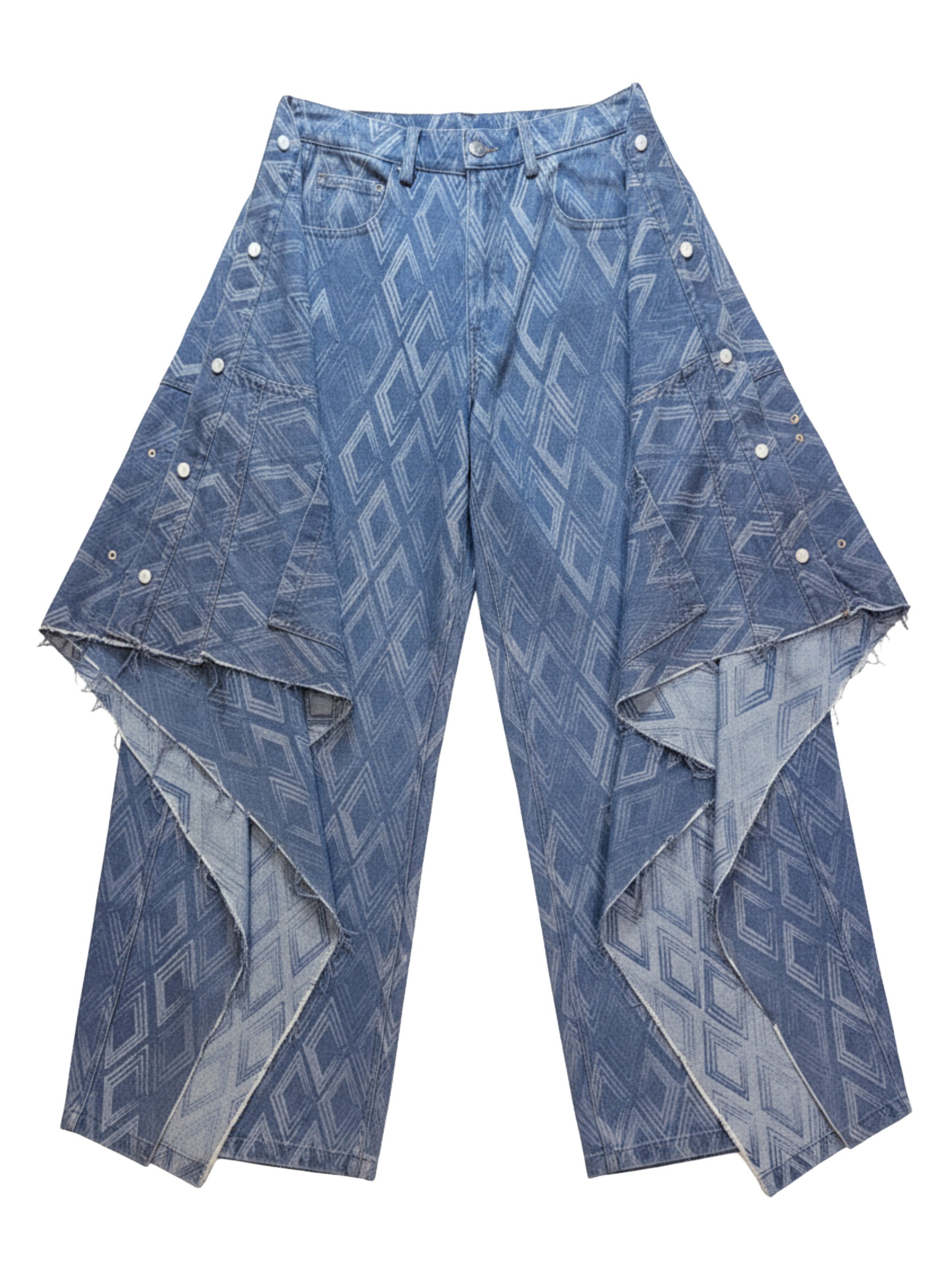 Denim jeans with diamond-patterned texture. Features side fabric panels with button attachment and frayed edges. Standard waistband with belt loops and front closure. Layered and draped side detailing.