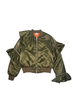 Relaxed fit satin bomber jacket with exaggerated zip-off ruffles on the sleeves and shoulders. A mix of streetwear and romantic drama, finished with ribbed cuffs and hem, structured silhouette. Features side pockets and zip accents on the sleeves.