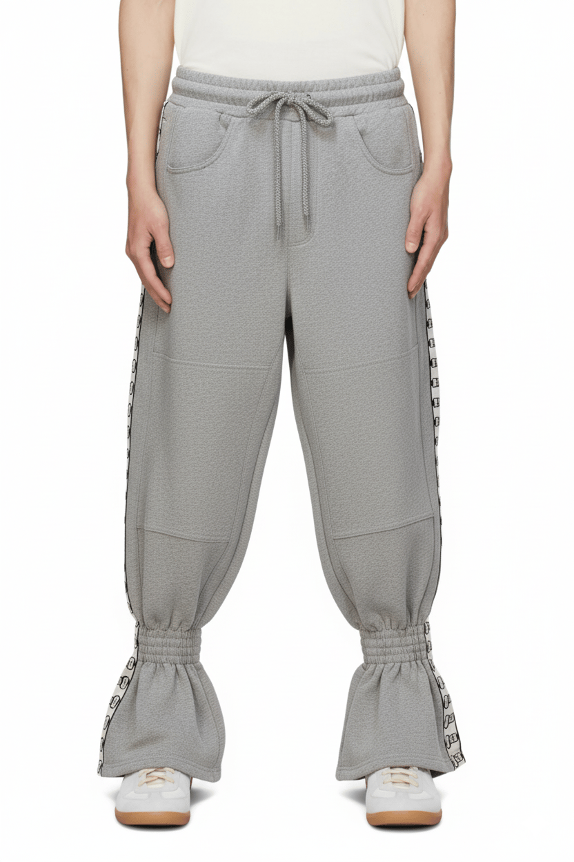Sweatpants with elastic waistband and drawstring. Two front pockets. Elasticated cuffs with balloon effect. Side panels with patterned strip detail.