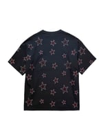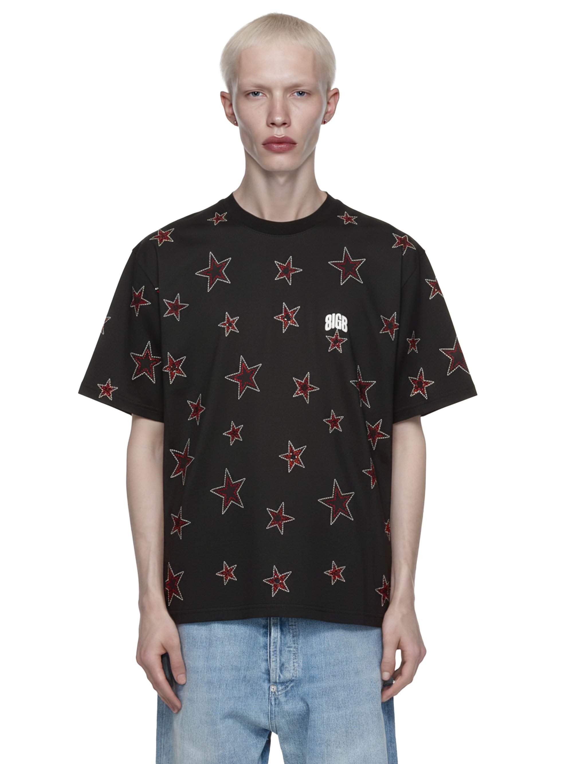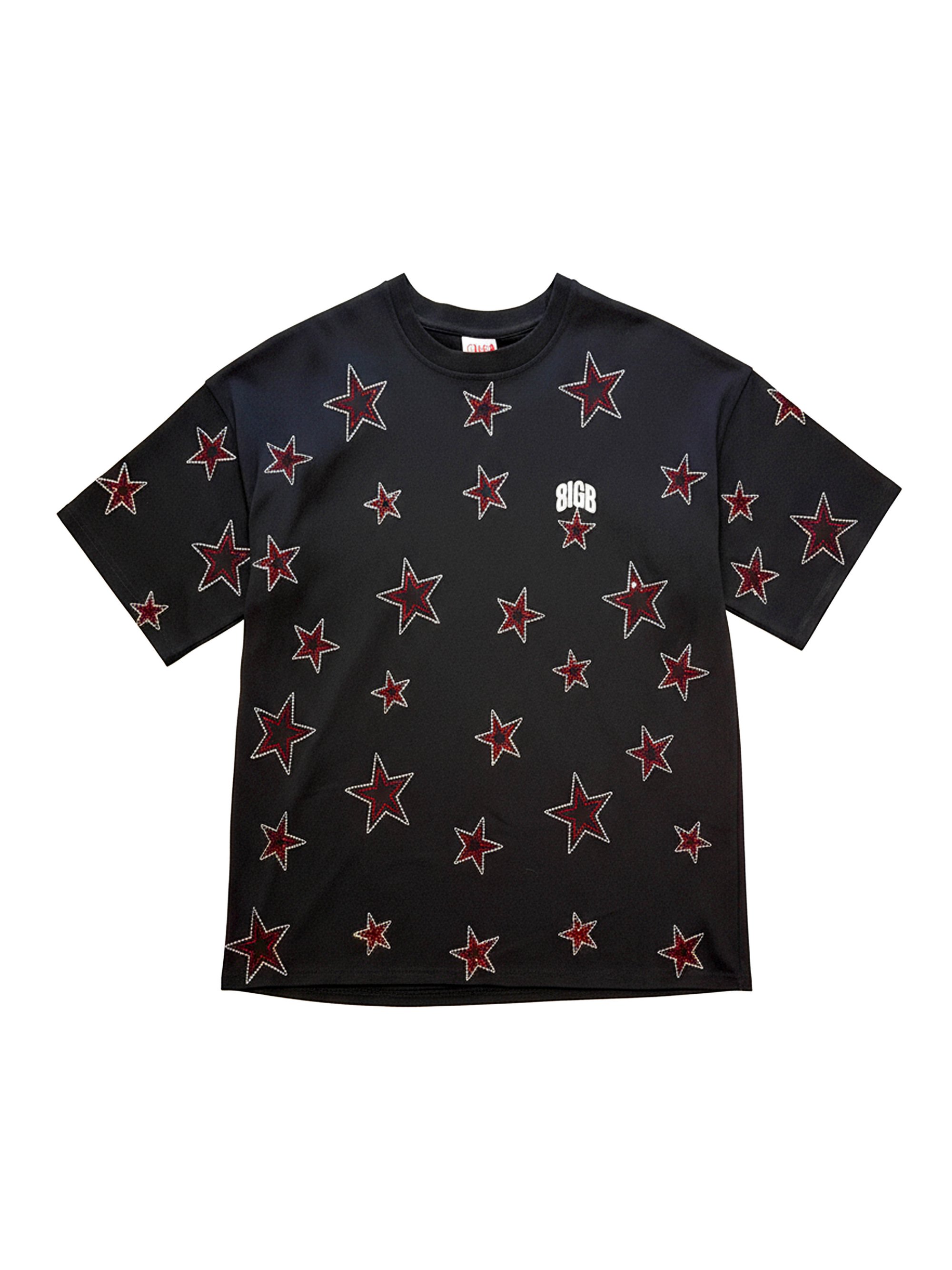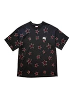 Short-sleeved crew neck t-shirt with straight hem. Small embroidered logo on left chest, with red thermopressed crystal stars sparkle effect.